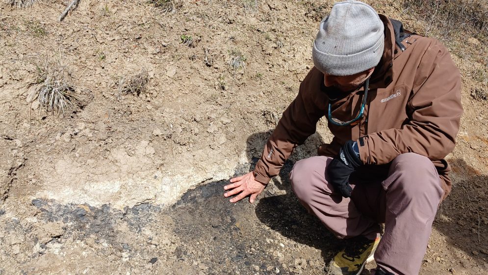 El investigador Gustavo Villarosa analiza las condiciones del suelo en la zona afectada por los incendios.