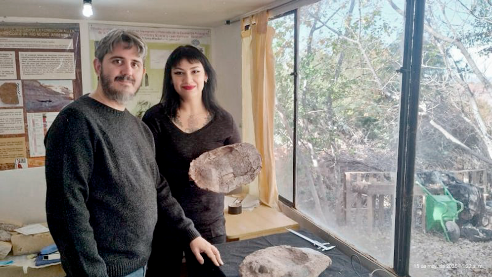 Ignacio Maniel y Mariana Sarda, investigadores del CONICET en el IDEVEA, junto al holotipo de Elkanemys caelestis. Gentileza investigadores.