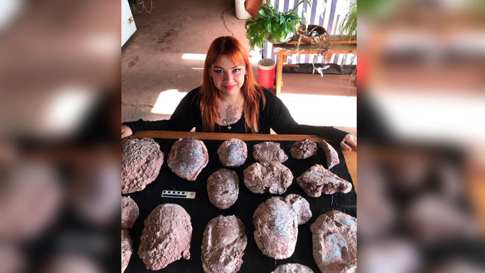 Mariana Sarda junto a ejemplares referidos a Elkanemys caelestis. Gentileza investigadores.