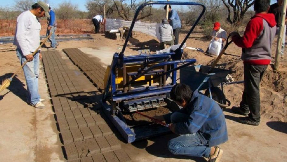 A partir de experiencias de capacitación, en comunidades de Pareditas (San Carlos) y Tres Cruces (Lavalle) (en la foto), sobre las cualidades técnicas, factibilidad productiva y potencialidades de uso de estos ladrillos se promueve la posibilidad de generar un emprendimiento económico pudiéndose alcanzar una escala de elaboración de mil unidades diarias.